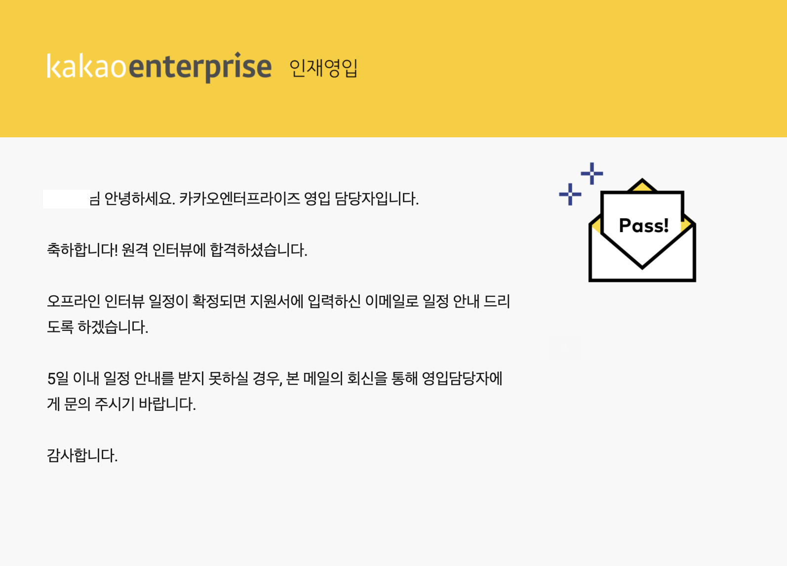 결과는 매우 빨리 나왔다. 금요일 오후 6시에 면접을 보고 월요일 오후에 바로 결과가 나왔다. 많이 떨리기도 하고 대답 못한 부분도 있어서 기대를 안 하고 있었는데 의외의 결과에 놀랐고 실제로 판교 카카오 사옥에 들어가 볼 수 있다는 사실에 기뻤다.