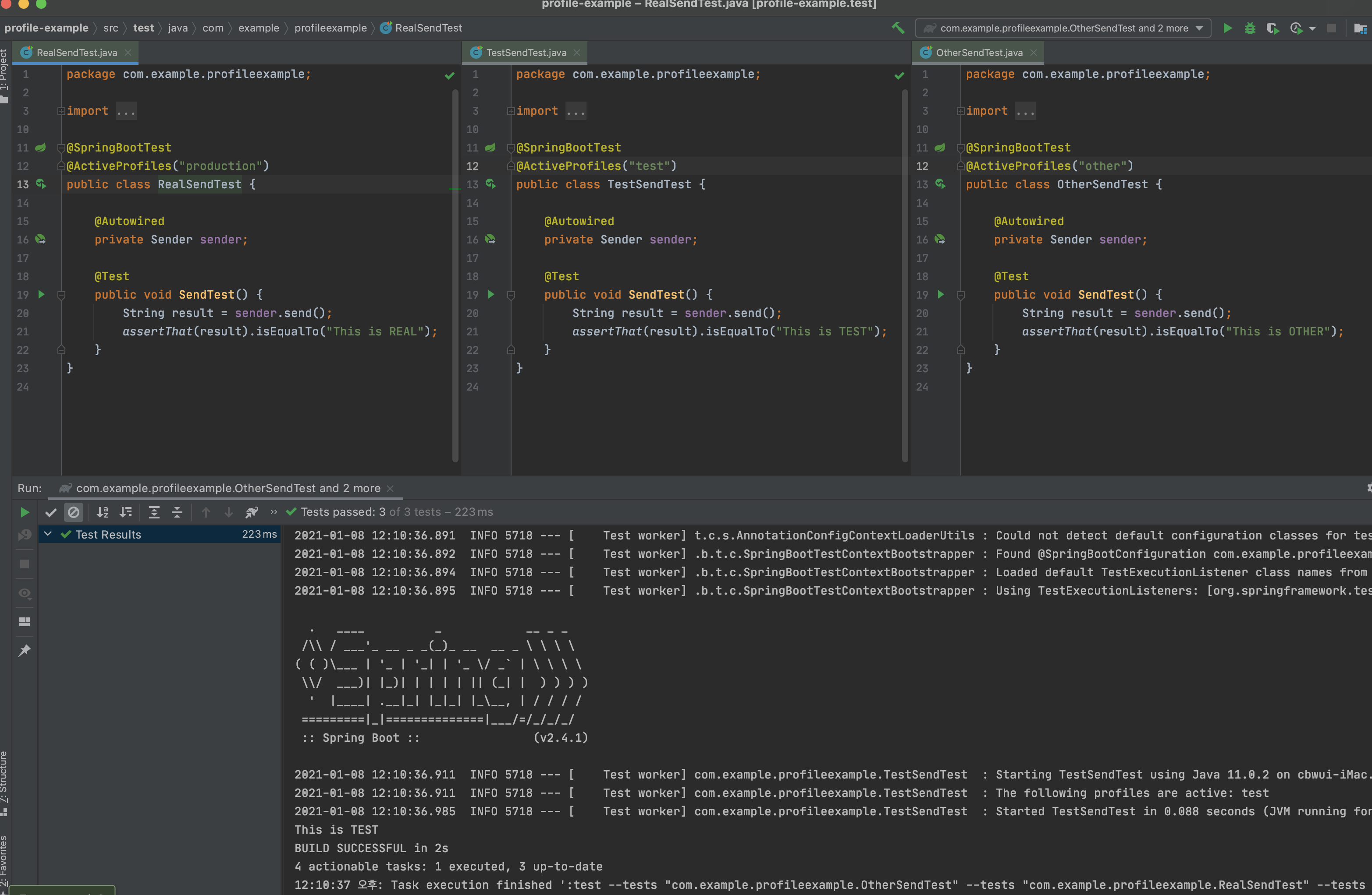 어플리케이션 실행 시 각각의 profile에 따라 다른 값이 빈이 동작하는 것을 확인 할 수 있다.