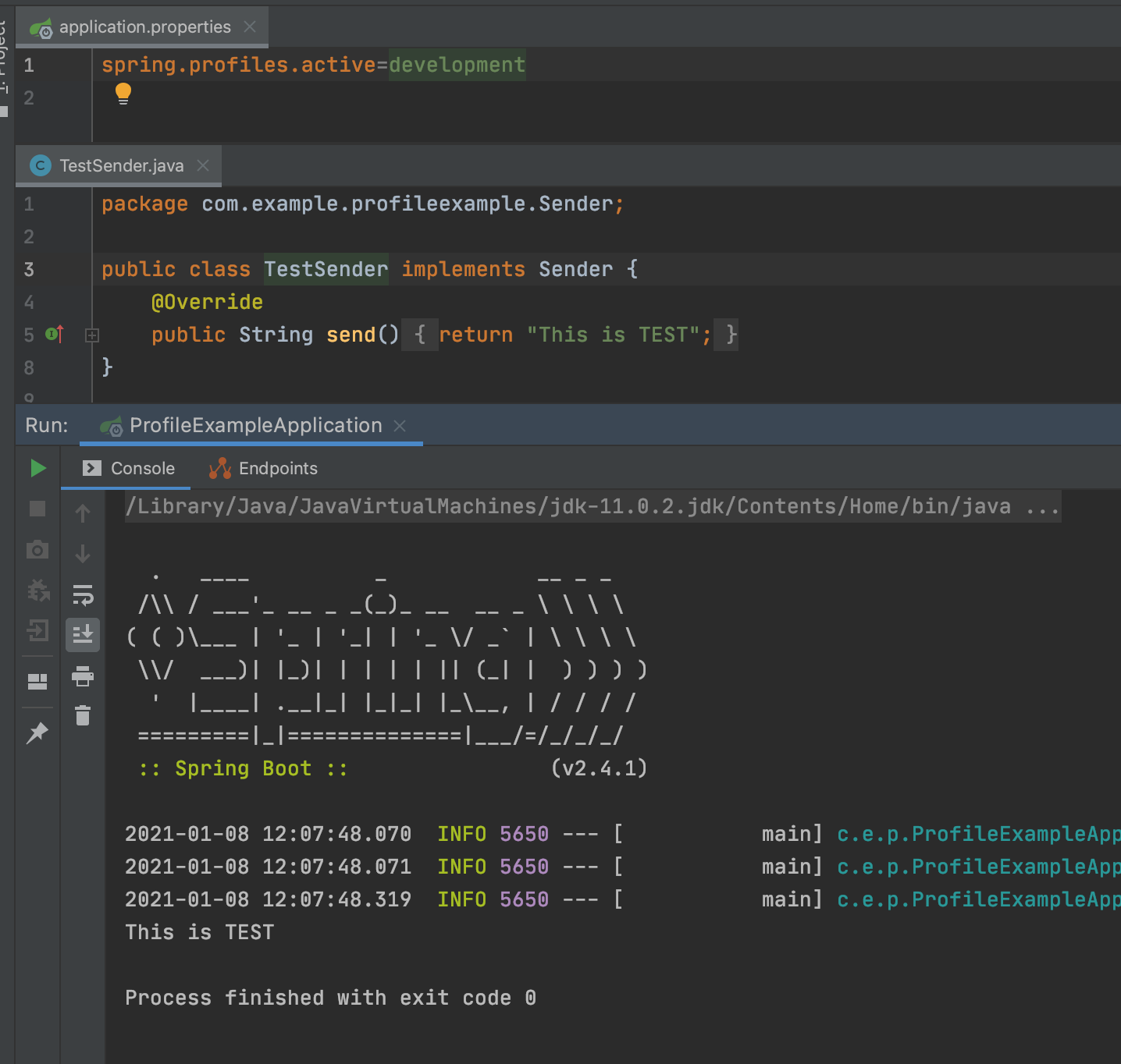 테스트 클래스에 @ActiveProfiles("development") 라고 작성하게 되면, 해당 클래스는 profile이 development인 채로 테스트 하게 된다.